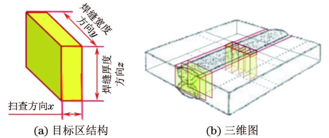 (3) 目標(biāo)區(qū)的定義:為了研究FMC-TFM聲場和進行全聚焦相控陣檢測而人為設(shè)置的區(qū)域(體積)。對面陣列探頭而言,目標(biāo)區(qū)可設(shè)定為一個矩形體積,高度z等于焊縫母材厚度,寬度y等于焊接接頭寬度(焊縫寬度+兩側(cè)熱影響區(qū)寬度);長度x(掃查方向)一般不超過探頭孔徑的1/2(見圖5)。