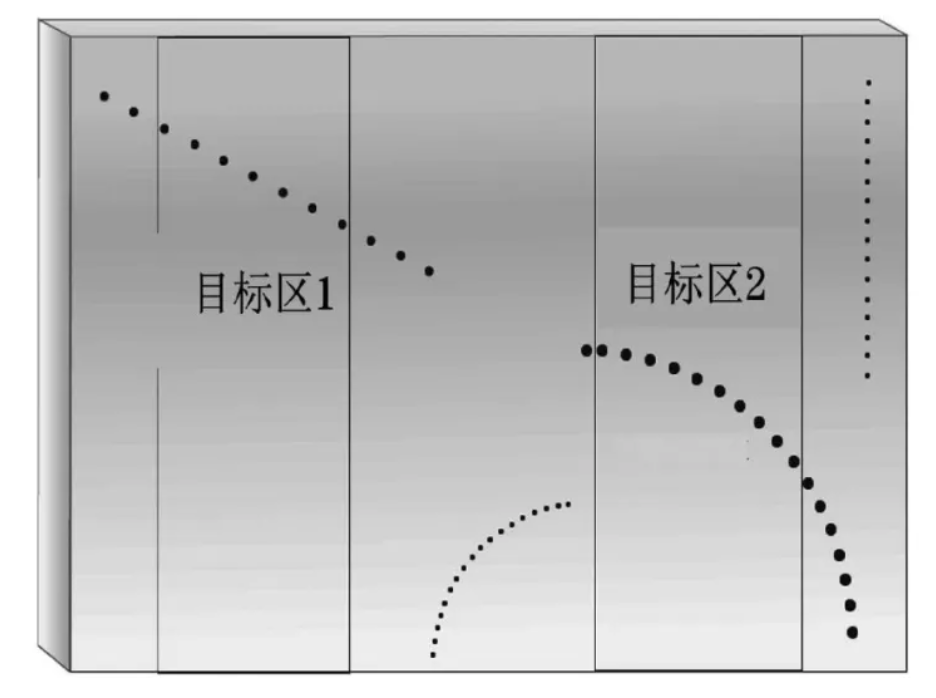 相控陣B型試塊檢測(cè)區(qū)示意如圖10所示,在試塊上設(shè)定目標(biāo)區(qū),分別采用傳統(tǒng)相控陣線掃、扇掃和全聚焦相控陣技術(shù)進(jìn)行了信噪比對(duì)比試驗(yàn)。